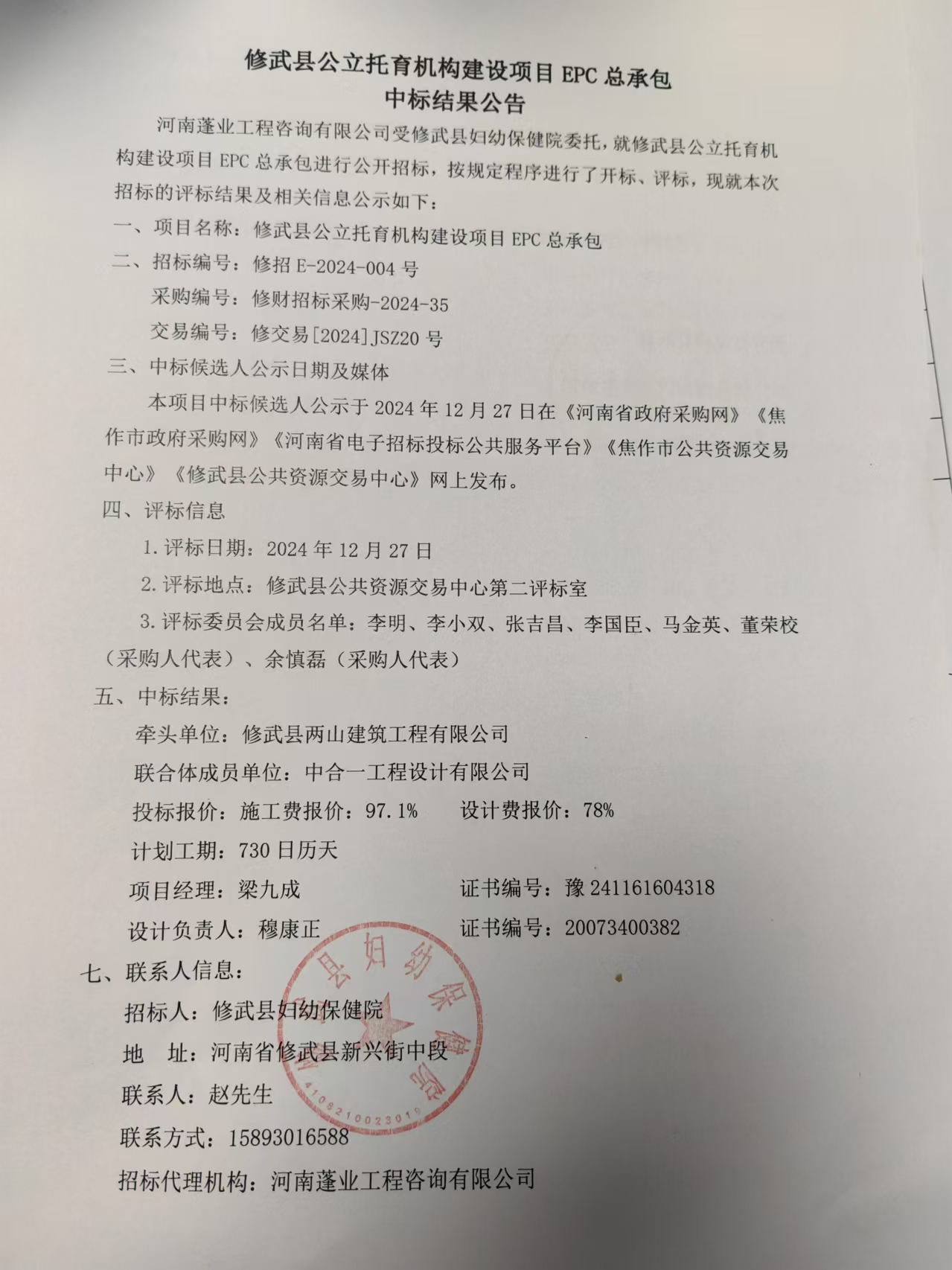 修武县妇幼保健院修武县公立托育机构建设项目EPC总承包项目-中标公告